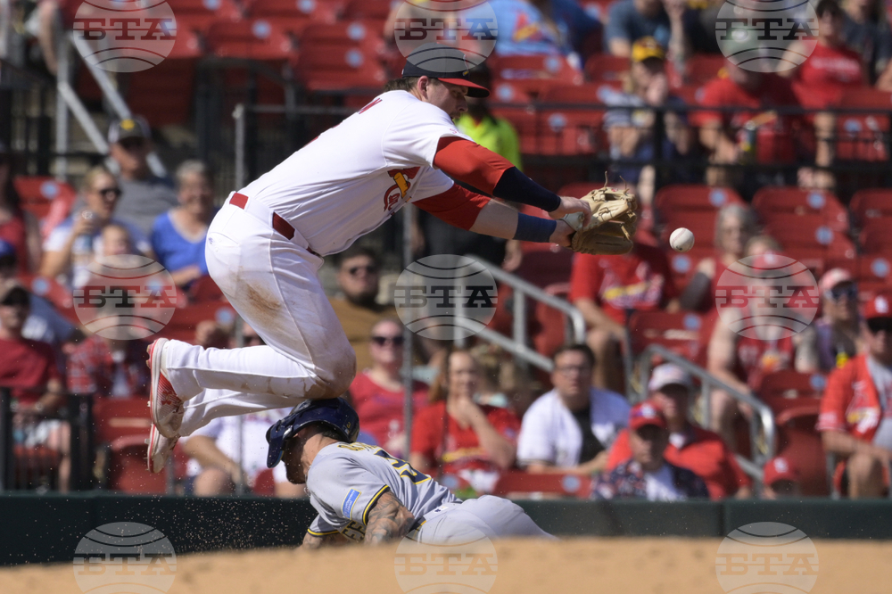 Milwaukee Brewers' Joey Ortiz, bottom, is safe from St. Louis Cardinals third baseman Nolan Gorman after hitting a triple during the fifth inning of a baseball game Sunday, Sept. 21, 2025, in St. Louis. (AP Photo/Jeff Le)