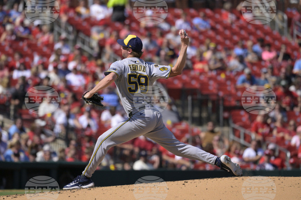 Milwaukee Brewers pitcher Erick Fedde throws against the St. Louis Cardinals during the fourth inning of a baseball game Sunday, Sept. 21, 2025, in St. Louis. (AP Photo/Jeff Le)