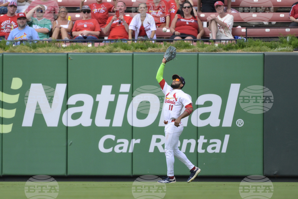 St. Louis Cardinals center fielder Victor Scott II (11) catches a fly ball hit by Milwaukee Brewers' Brice Turang during the ninth inning of a baseball game Sunday, Sept. 21, 2025, in St. Louis. (AP Photo/Jeff Le)