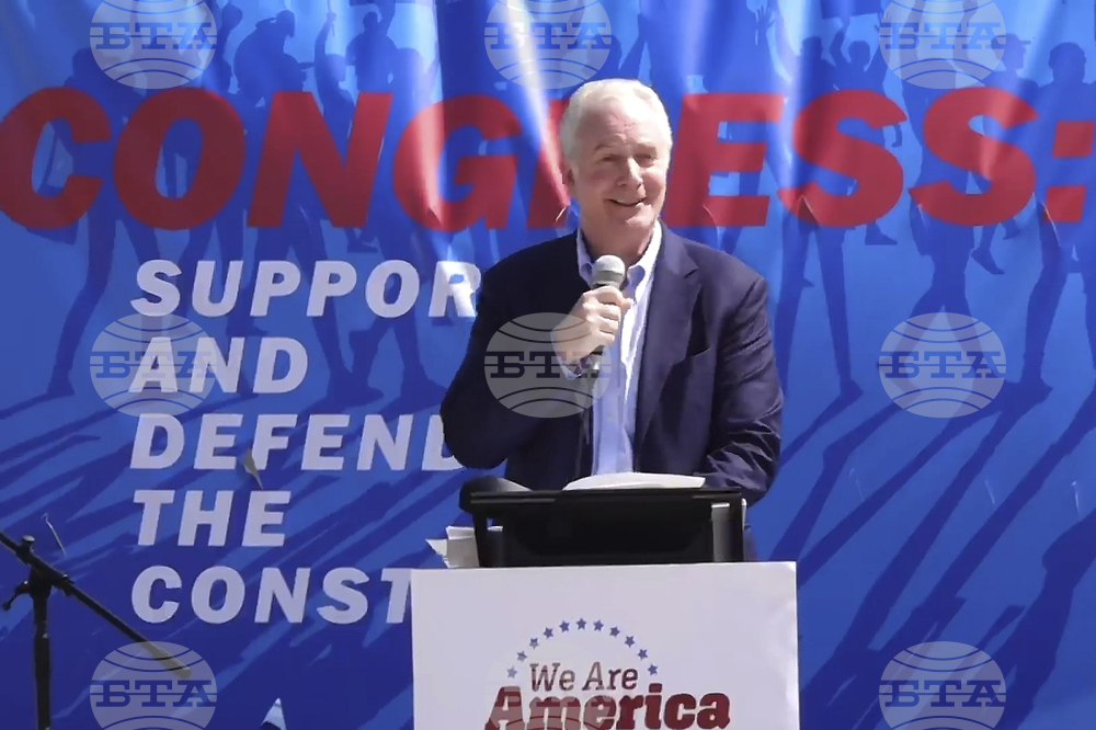 Sen. Chris Van Hollen, D-Md., speaks at the We Are America March, Friday, Sept. 19, 2025, in Washington. (AP Photo/ Mike Pesoli)