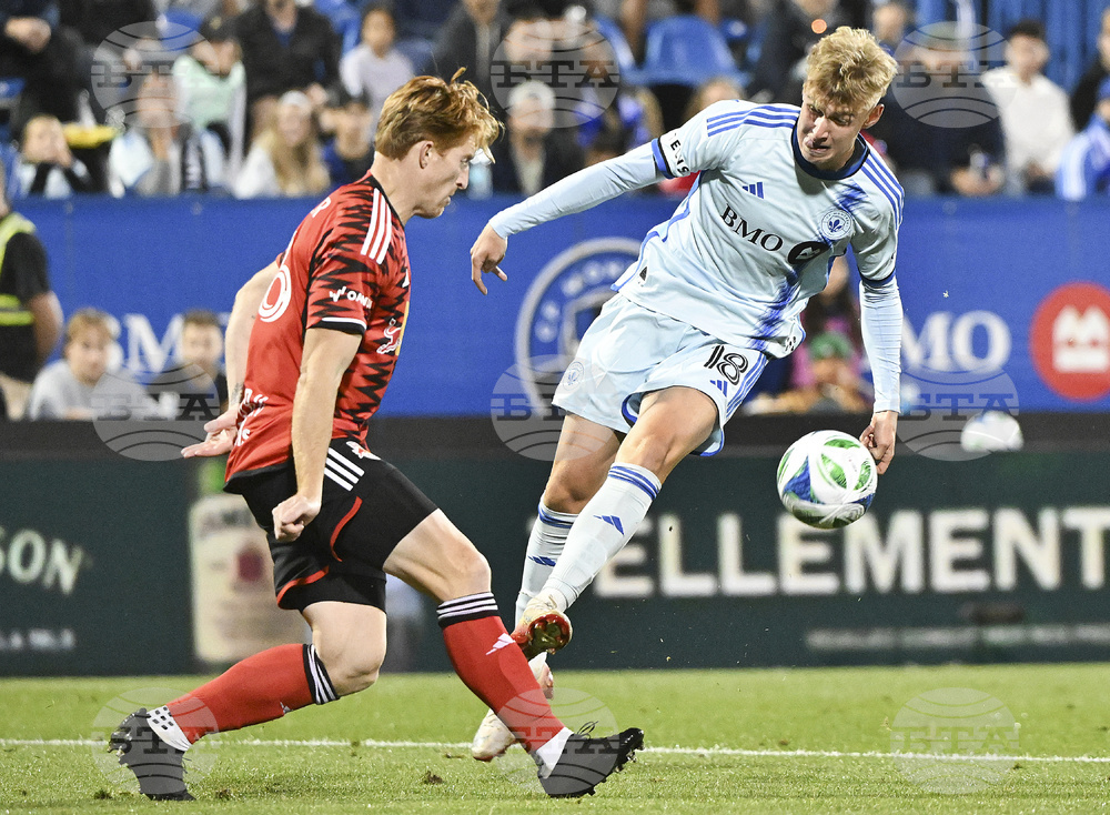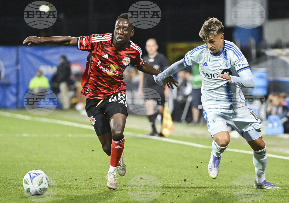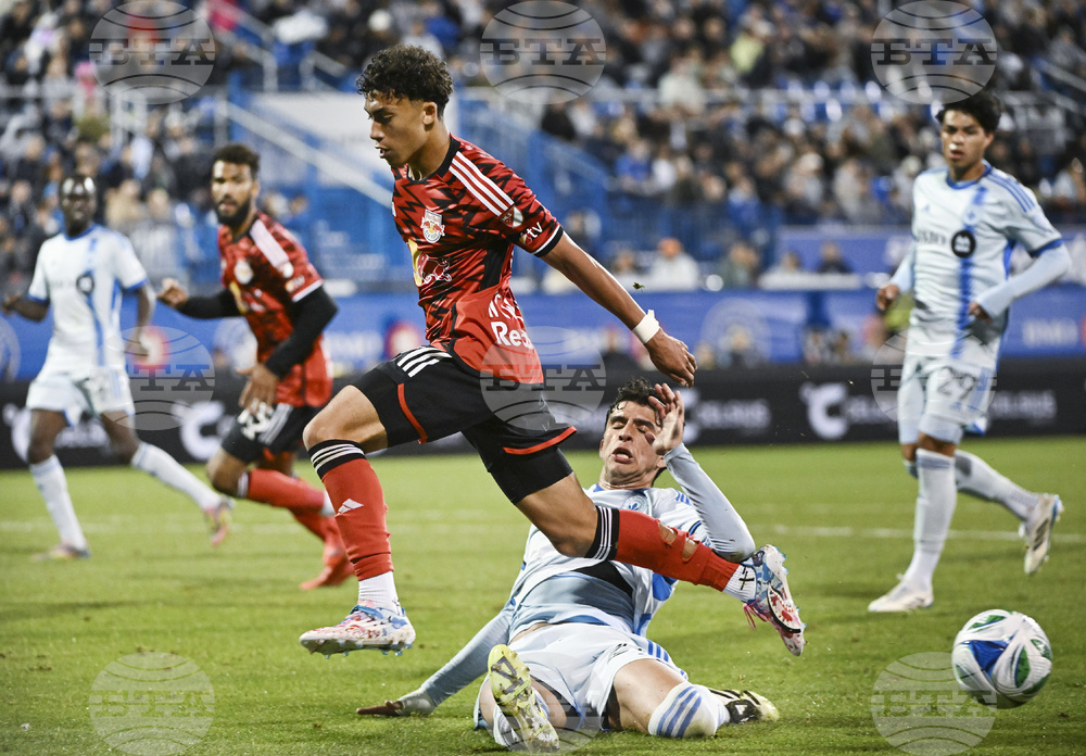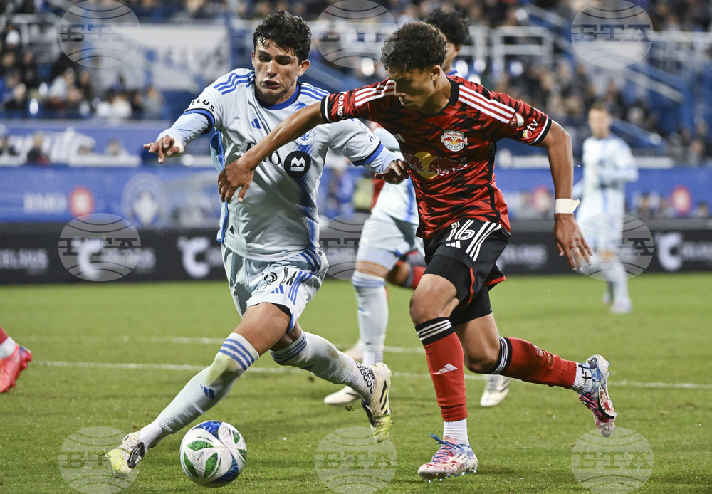 New York Red Bulls' Tim Parker, left, blocks a shot by CF Montreal's Hennadii Synchuk (18) during the first half MLS soccer match in Montreal, Saturday, Sept. 20, 2025. (Graham Hughes/The Canadian Press via AP)