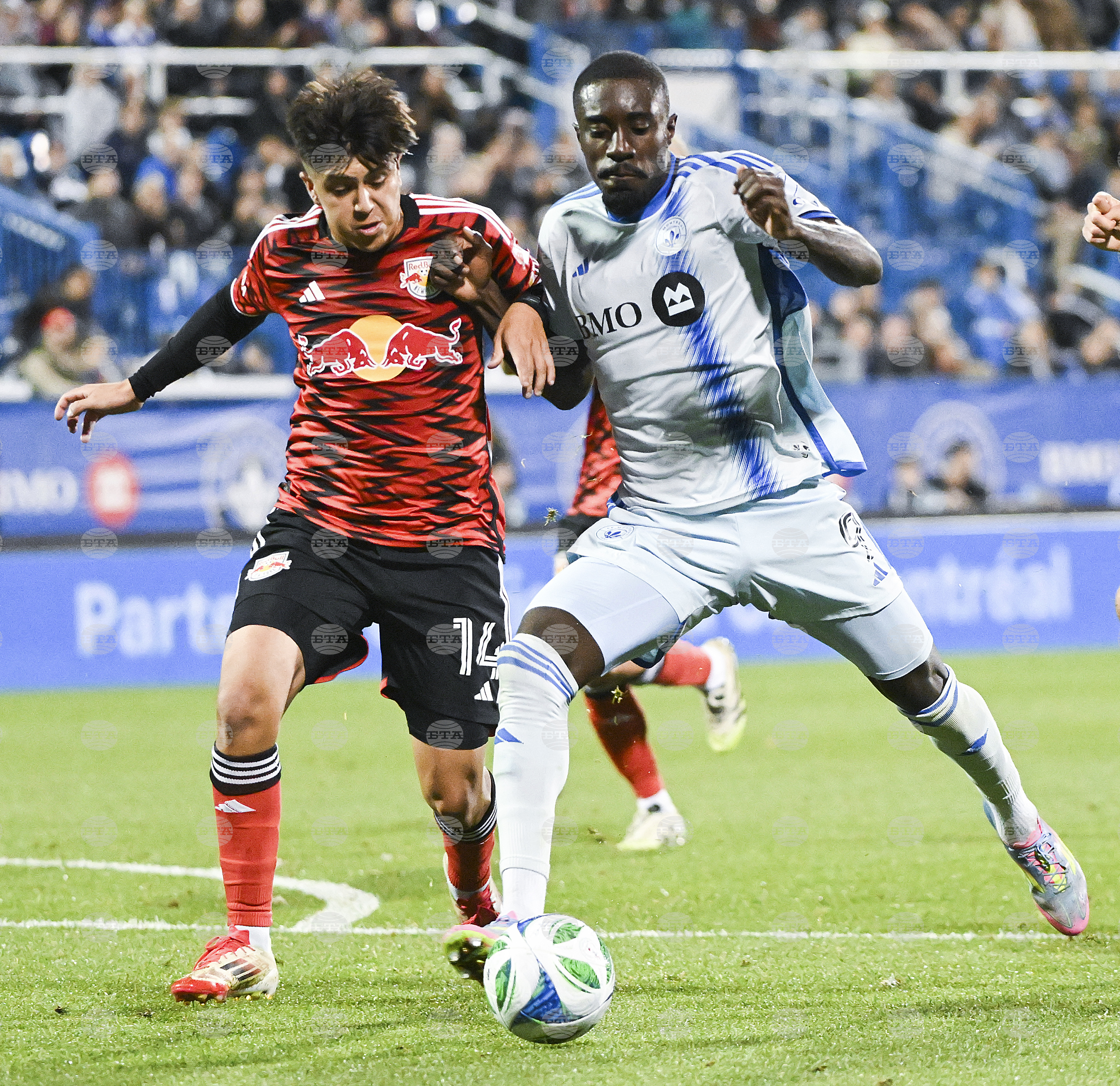 CF Montreal's Dante Sealy (25) tries to get around New York Red Bulls' Gustav Berggren during the first half MLS soccer match in Montreal, Saturday, Sept. 20, 2025. (Graham Hughes/The Canadian Press via AP)