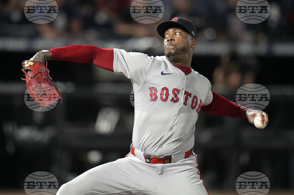 Boston Red Sox pitcher Aroldis Chapman delivers to the Tampa Bay Rays during the ninth inning of a baseball game Saturday, Sept. 20, 2025, in Tampa, Fla. (AP Photo/Chris O'Meara)