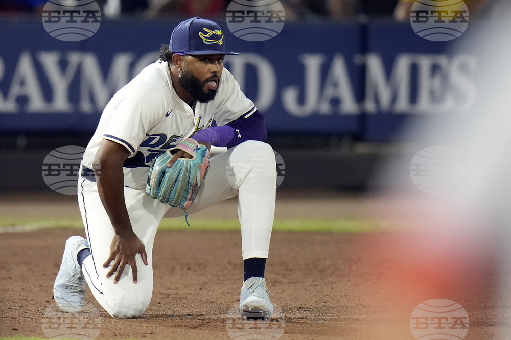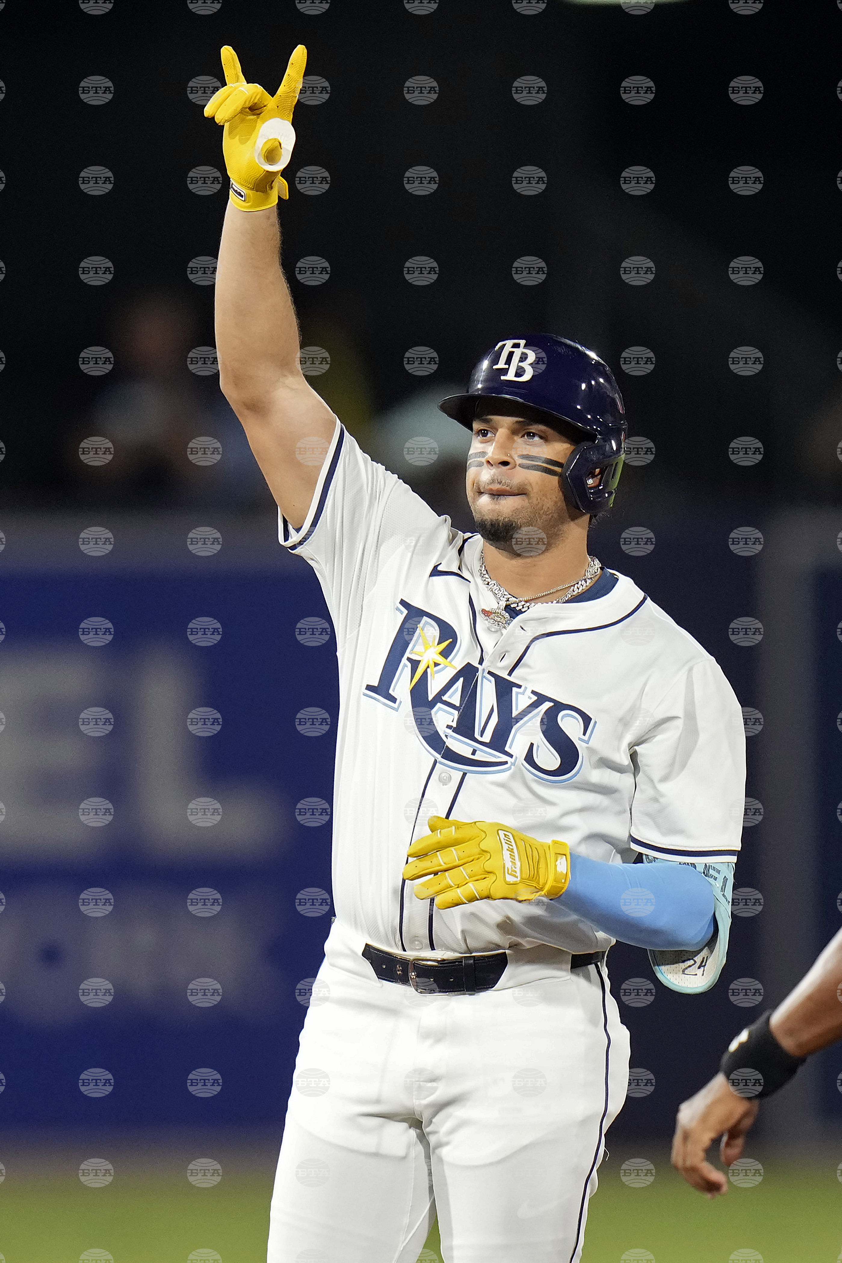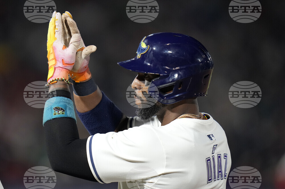 Tampa Bay Rays' Yandy Díaz celebrates his RBI single off Boston Red Sox pitcher Justin Slaten during the seventh inning of a baseball game Saturday, Sept. 20, 2025, in Tampa, Fla. (AP Photo/Chris O'Meara)