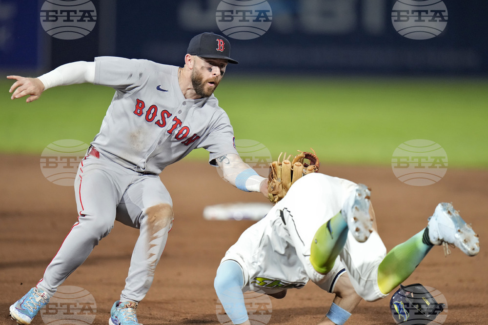 Boston Red Sox shortstop Trevor Story, left, tgs out Tampa Bay Rays' Jake Mangum after he was caught in a rundown during the eighth inning of a baseball game Saturday, Sept. 20, 2025, in Tampa, Fla. (AP Photo/Chris O'Meara)