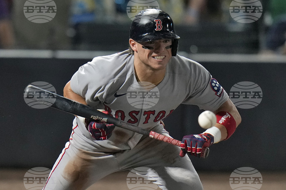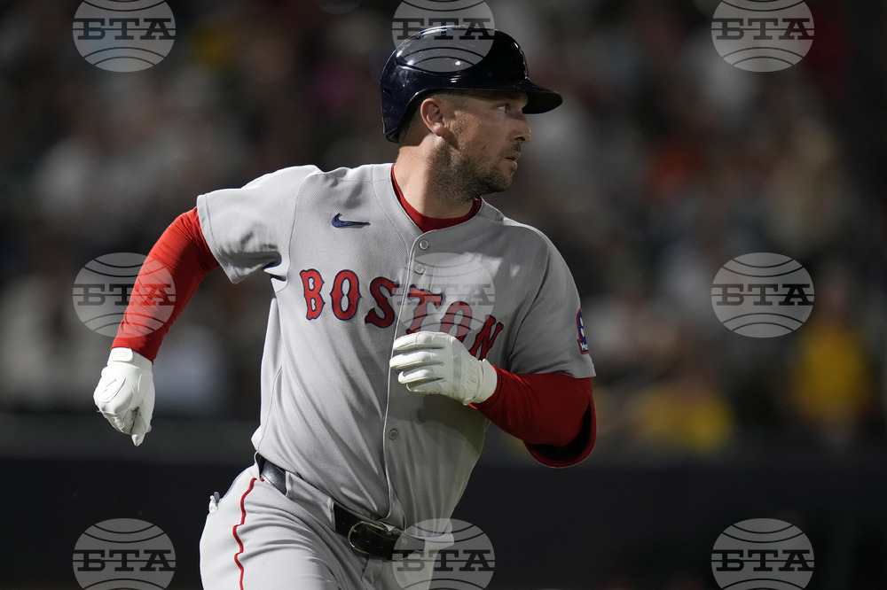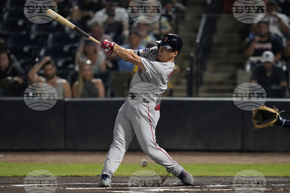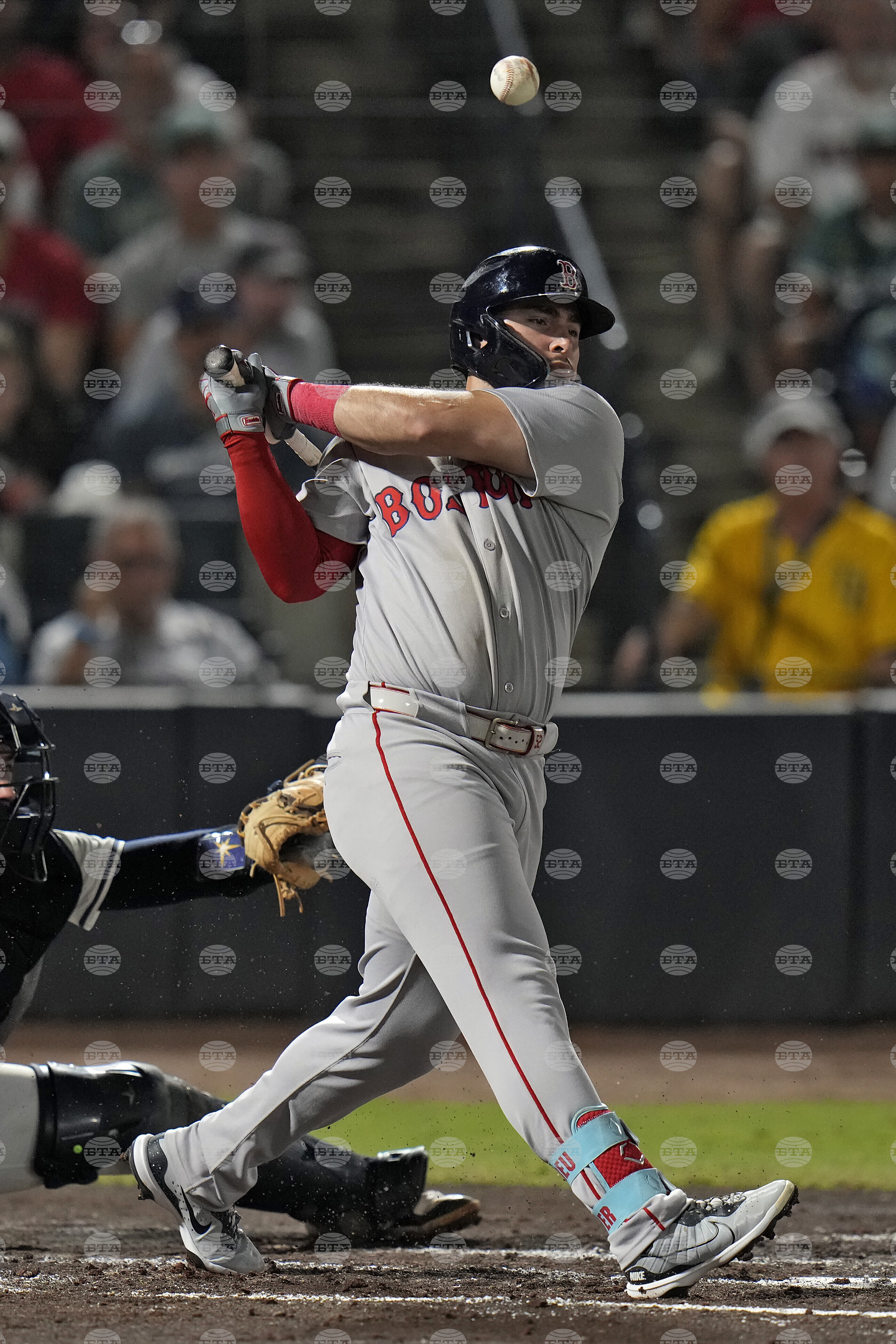 Boston Red Sox's Masataka Yoshida, of Japan, watches his single off Tampa Bay Rays pitcher Joe Boyle during the first inning of a baseball game Sunday, Sept. 21, 2025, in Tampa, Fla. (AP Photo/Chris O'Meara)