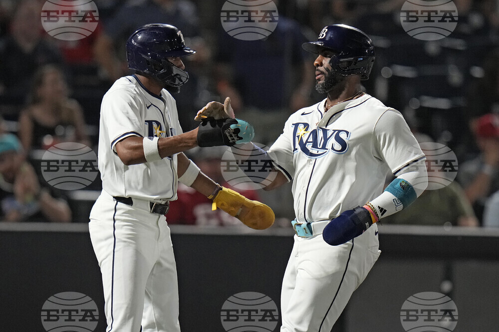Tampa Bay Rays' Yandy Díaz, right, and Chandler Simpson celebrate after scoring on a two-run double by Christopher Morel off Boston Red Sox pitcher Connelly Early during the first inning of a baseball game Sunday, Sept. 21, 2025, in Tampa, Fla. (AP Photo/Chris O'Meara)