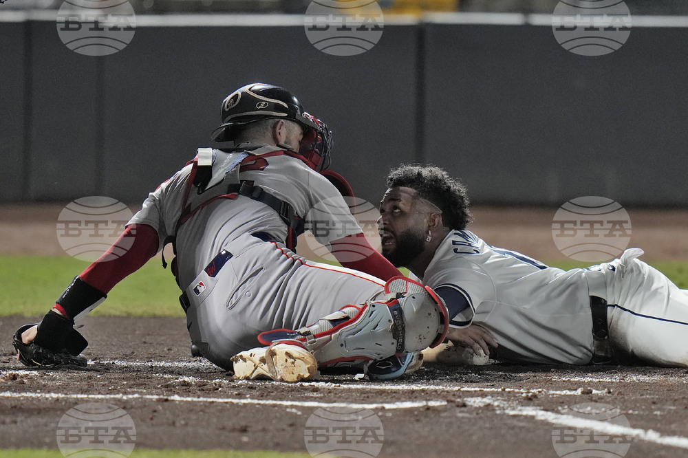 Boston Red Sox's Alex Bregman scores around the tag by Tampa Bay Rays catcher Nick Fortes (40) on a sacrifice fly by Romy Gonzalez during the ninth inning of a baseball game Saturday, Sept. 20, 2025, in Tampa, Fla. (AP Photo/Chris O'Meara)