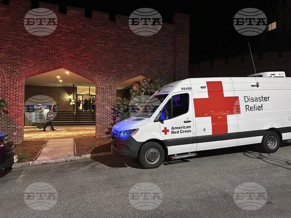 An American Red Cross Disaster Relief van is parked outside a hotel that is acting as a reunification center after a shooting at a country club in Nashua, New Hampshire, Saturday, Sept. 20, 2025. (AP Photo/Michael Casey)