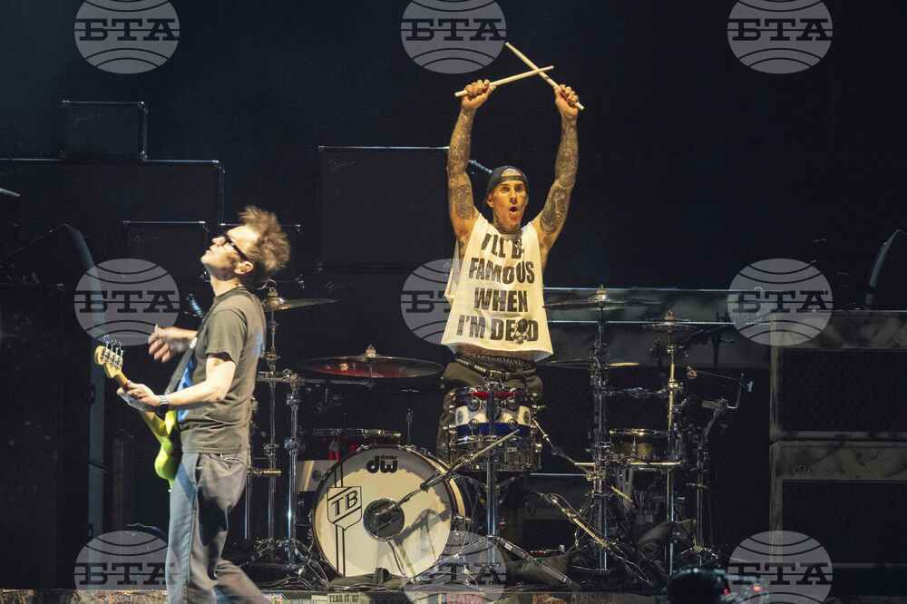 Travis Barker, of Blink 182, performs during the Shaky Knees Music Festival on Sunday, Sept. 21, 2025, at Piedmont Park in Atlanta. (Photo by Paul R. Giunta/Invision/AP)