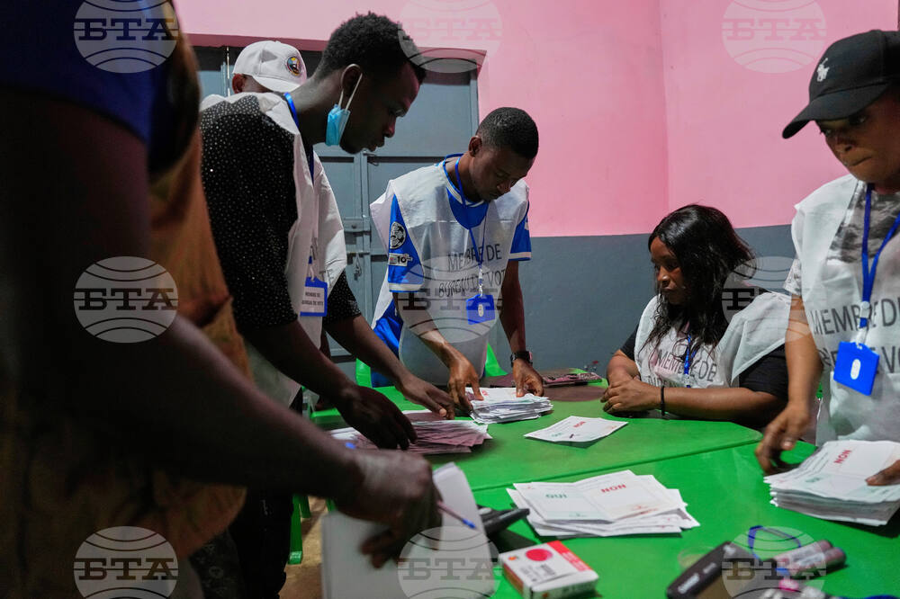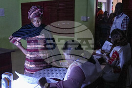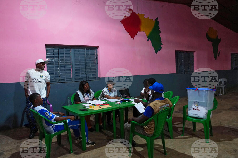 Officials wait at a polling station as polls close during the constitutional referendum in Conakry, Guinea, Sunday, Sept. 21, 2025. (AP Photo/Misper Apawu)