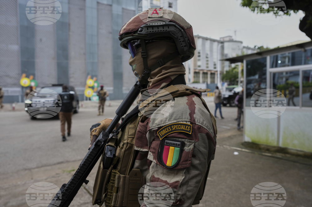 Guinean soldiers guard an entrance to the polling station where Gen. Mamadi Doumbouya casts his vote in the constitutional referendum, in Conakry, Guinea, Sunday, Sept. 21, 2025 (AP Photo/Misper Apawu)