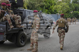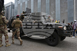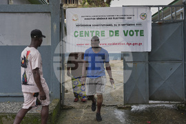 Guinean soldiers leave a polling station where Gen. Mamadi Doumbouya cast his vote in the constitutional referendum, in Conakry, Guinea, Sunday, Sept. 21, 2025(AP Photo/Misper Apawu)