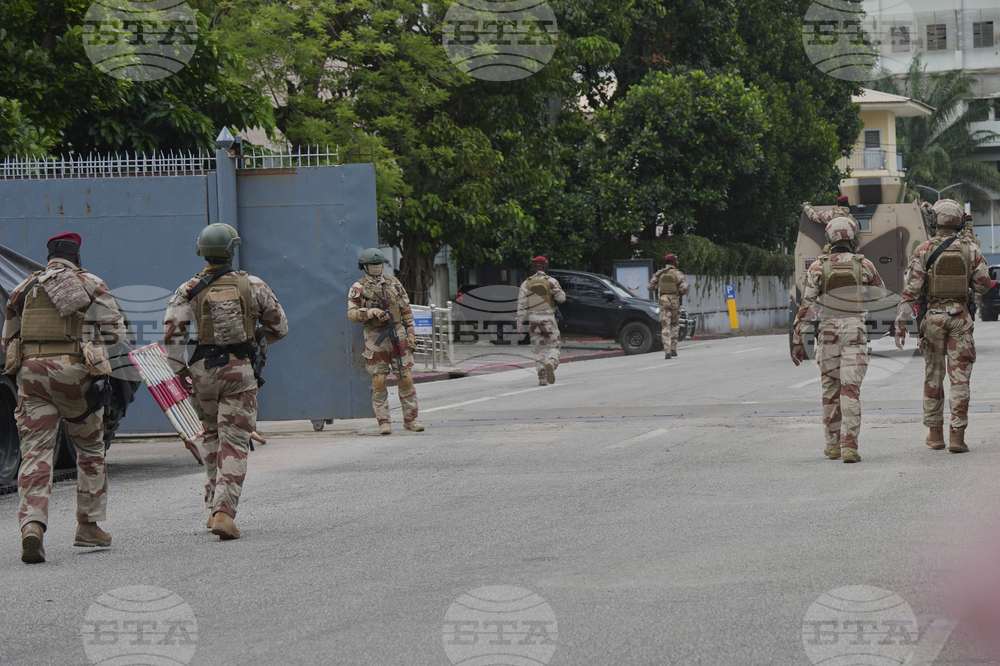 Guinean soldiers secure the area outside a polling station before Gen. Mamadi Doumbouya arrives to cast his vote in the constitutional referendum, in Conakry, Guinea, Sunday, Sept. 21, 2025. (AP Photo/Misper Apawu)