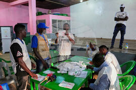 Election officials check voter lists and prepare ballots at a polling station, in Conakry, Guinea, Sunday, Sept. 21, 2025. (AP Photo/Misper Apawu)