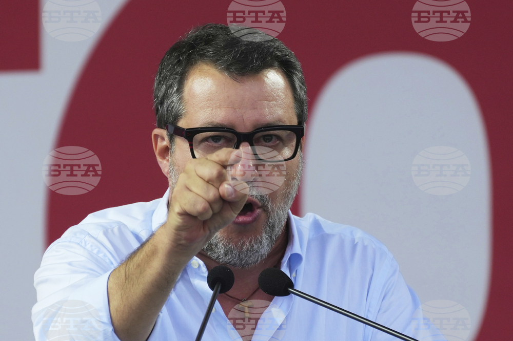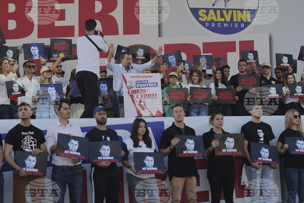 Italian Infrastructure Minister and leader of Italy's right-wing League party Matteo Salvini delivers his speech during the League party's annual gathering in Pontida, north of Italy, Sunday, Sept. 21, 2025. (AP Photo/Antonio Calanni)