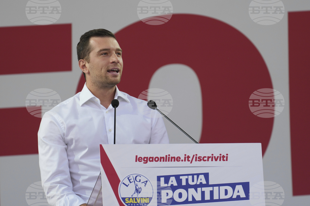 French far right party Rassemblement National (RN) president Jordan Bardella delivers his speech during the League's annual gathering in Pontida, north of Italy, Sunday, Sept. 21, 2025. (AP Photo/Antonio Calanni)