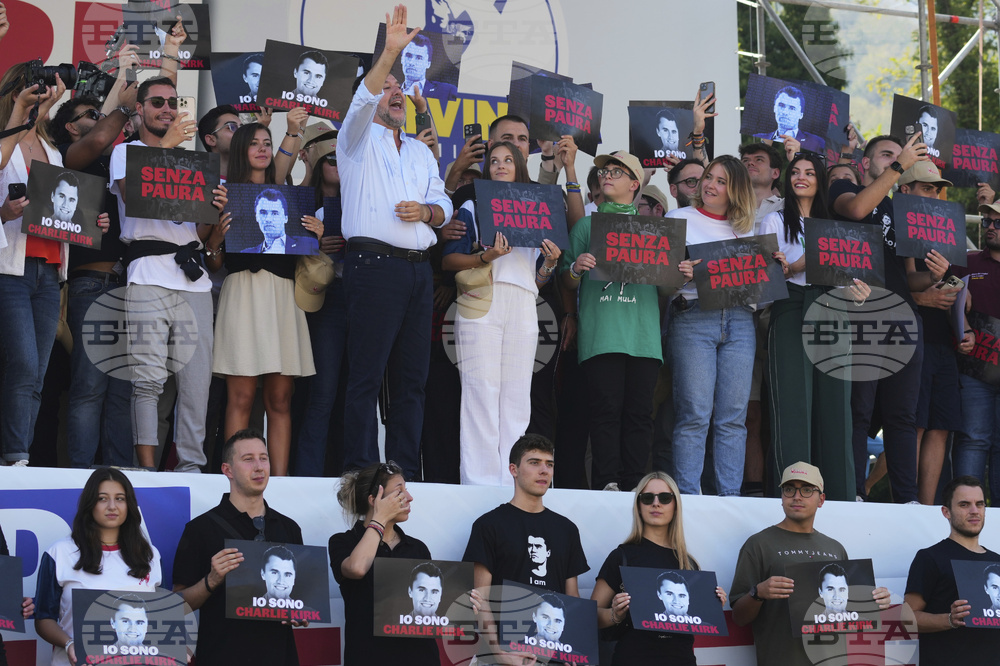 People hold posters that show Charlie Kirk and reads: "I am Charlie Kirk", during the League party's annual gathering in Pontida, north of Italy, Sunday, Sept. 21, 2025. (AP Photo/Antonio Calanni)