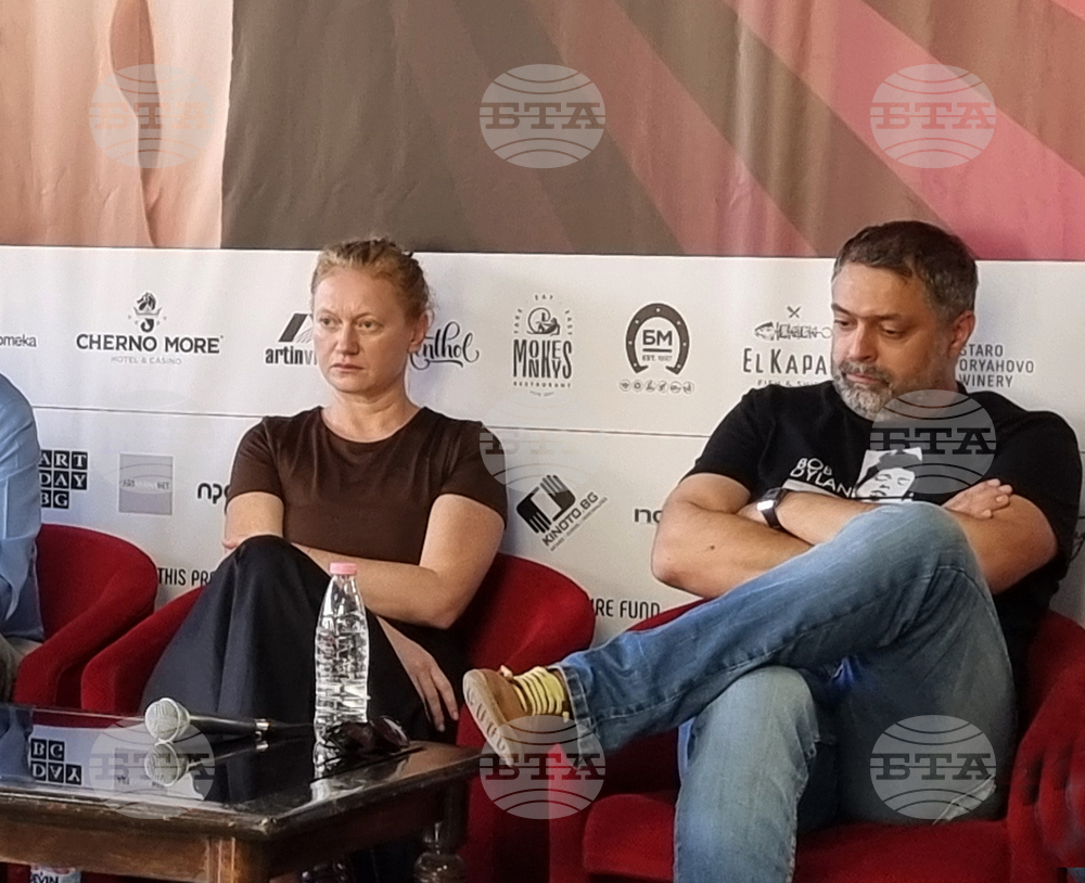 Варна (21 септември 2025) - Филмът „Made in EU” на Стефан Командарев се представя на фестивала „Златна роза“ във Варна. На снимката (от ляво надясно): актрисата Гергана Плетньова, и сценаристът Симеон Венциславов.