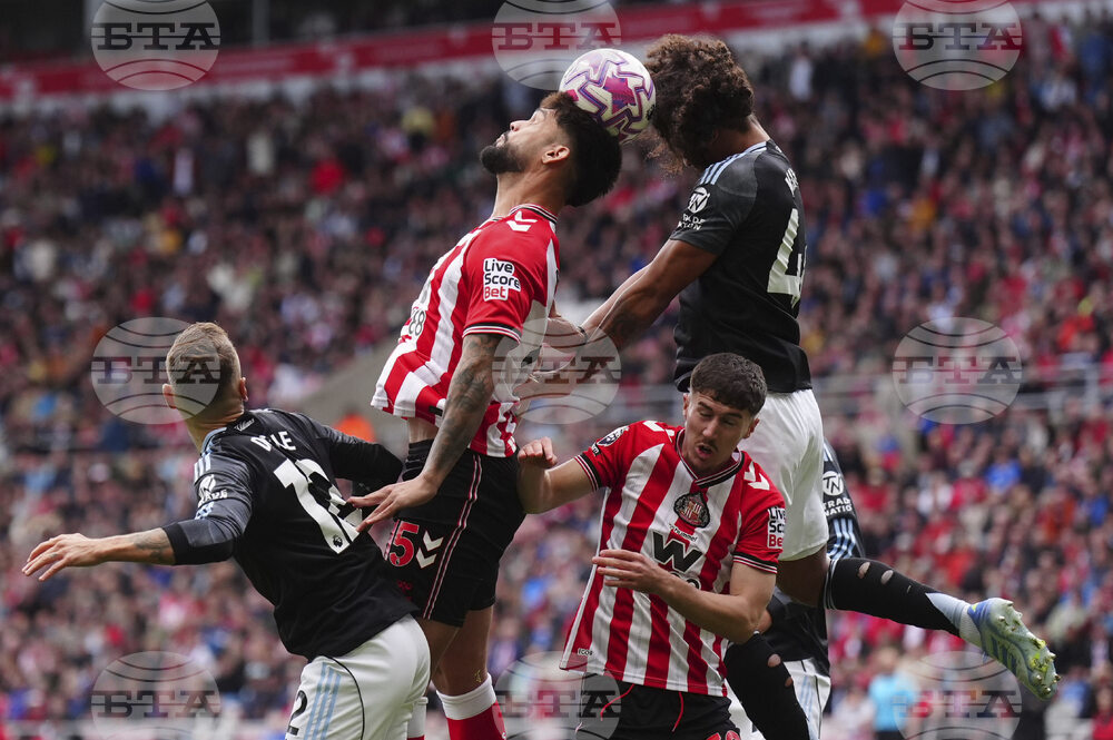 Sunderland's Wilson Isidor attempts a shot on goal during the English Premier League soccer match between Sunderland and Aston Villa at the Stadium of Light, in Sunderland, England, Sunday Sept. 21, 2025. (Owen Humphreys/PA via AP)
