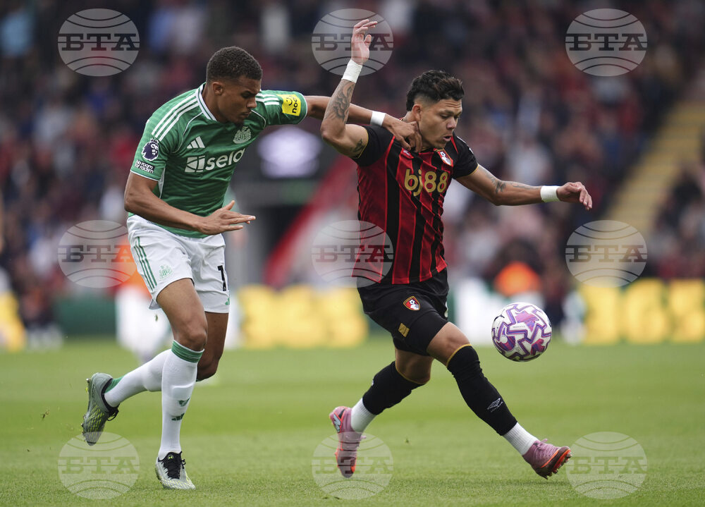Bournemouth's Bafode Diakite, left, and Newcastle United's Joe Willock battle for the ball during the English Premier League soccer match between Bournemouth and Newcastle United at Vitality Stadium, in Bournemouth, England, Sunday Sept. 21, 2025. (Adam Davy/PA via AP)