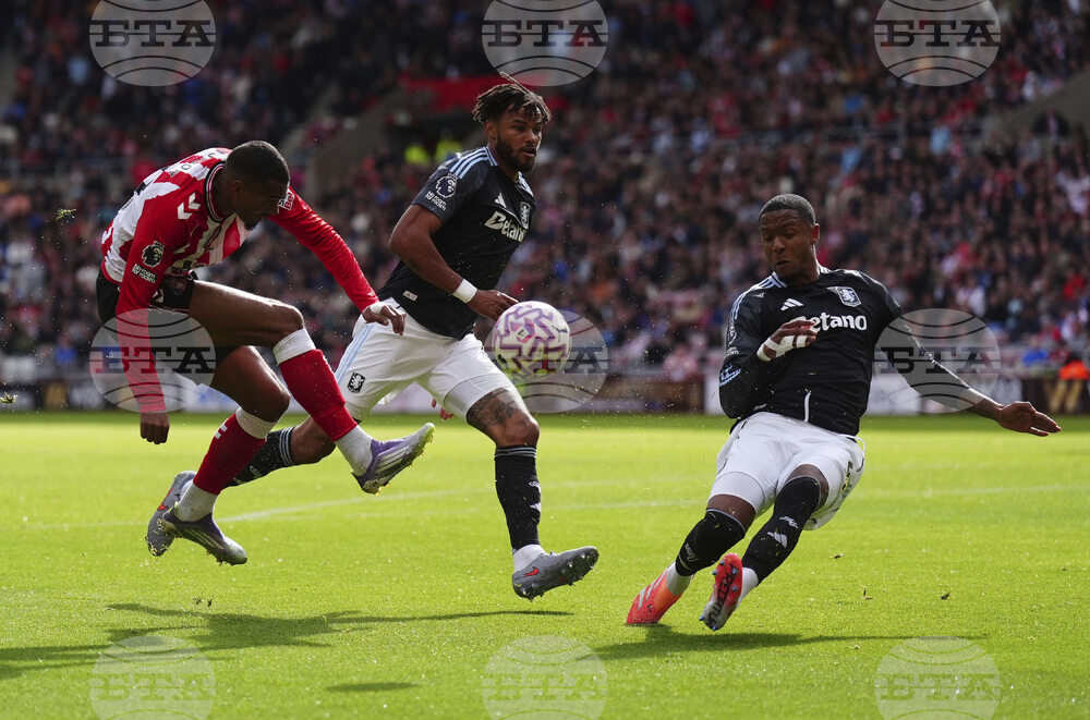 Sunderland's Wilson Isidor makes a shot on target during the English Premier League soccer match between Sunderland and Aston Villa at the Stadium of Light, in Sunderland, England, Sunday Sept. 21, 2025. (Owen Humphreys/PA via AP)