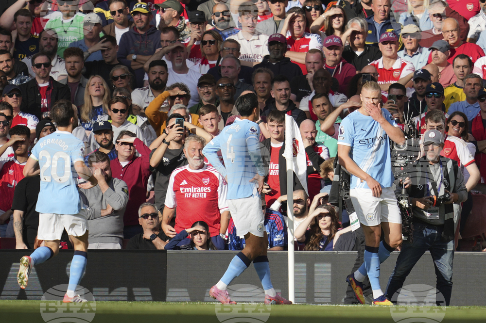 Manchester City players celebrate after a goal during the Premier League soccer match between Arsenal and Manchester City in London, Sunday, Sept. 21, 2025. (AP Photo/Kin Cheung)