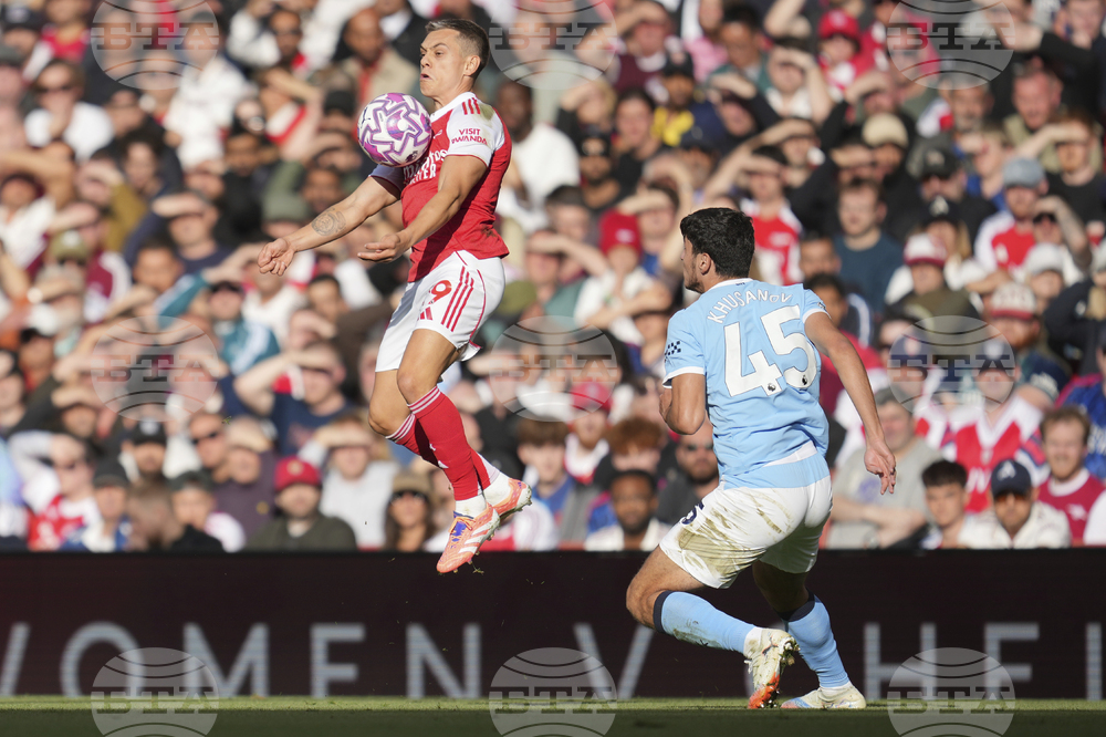 Arsenal's Leandro Trossard, left, and Manchester City's Abdukodir Khusanov fight for the ball during the Premier League soccer match between Arsenal and Manchester City in London, Sunday, Sept. 21, 2025. (AP Photo/Kin Cheung)