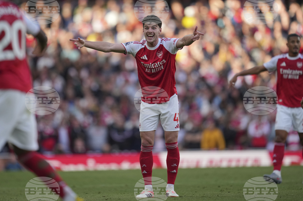 Arsenal's Declan Rice reacts during the Premier League soccer match between Arsenal and Manchester City in London, Sunday, Sept. 21, 2025. (AP Photo/Kin Cheung)