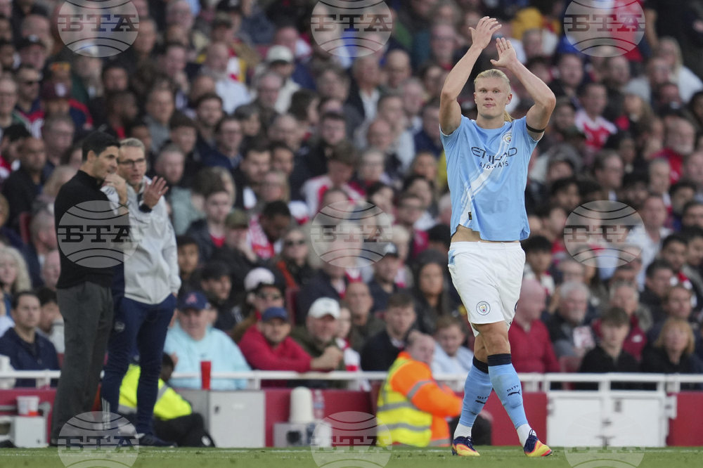 Manchester City's Erling Haaland points during the Premier League soccer match between Arsenal and Manchester City in London, Sunday, Sept. 21, 2025. (AP Photo/Kin Cheung)