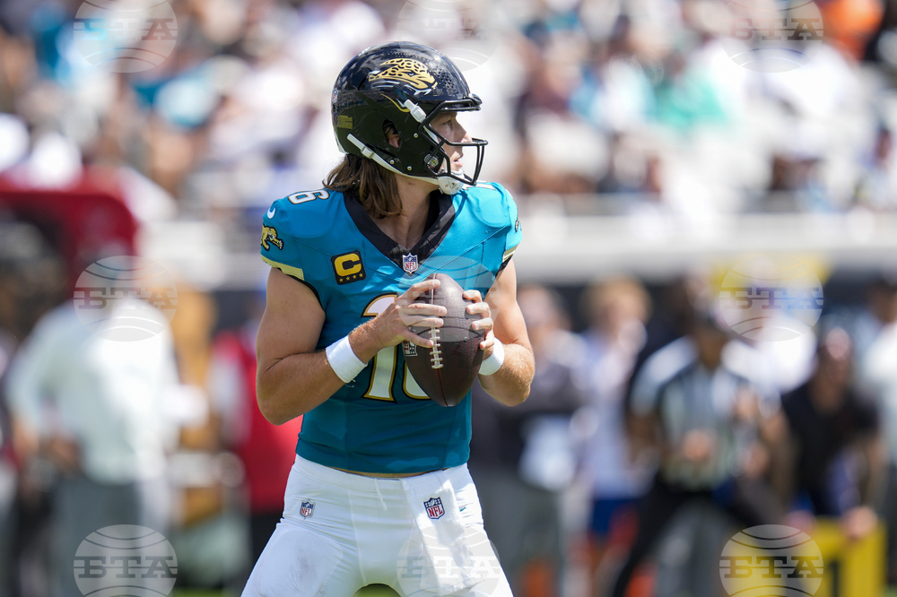 Jacksonville Jaguars quarterback Trevor Lawrence looks to pass against the Houston Texans during the first half of an NFL football game Sunday, Sept. 21, 2025, in Jacksonville, Fla. (AP Photo/Phelan M. Ebenhack)