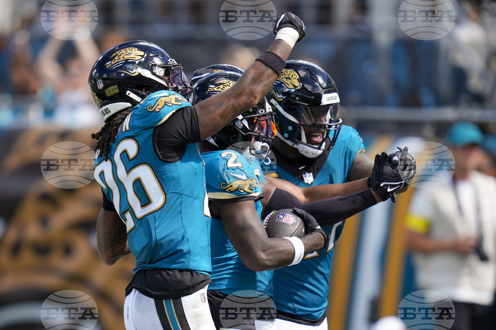 Jacksonville Jaguars running back Bhayshul Tuten (33) reacts after scoring a touchdown against the Houston Texans during the first half of an NFL football game Sunday, Sept. 21, 2025, in Jacksonville, Fla. (AP Photo/John Raoux)