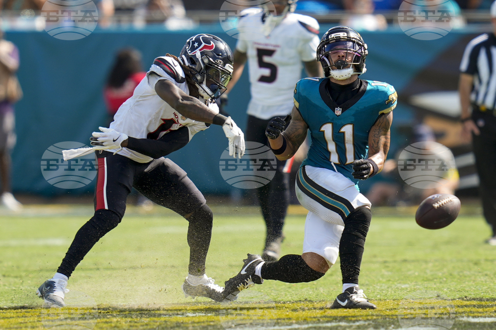 Jacksonville Jaguars wide receiver Parker Washington, right, drops a pass as Houston Texans cornerback Tremon Smith applies pressure during the second half of an NFL football game Sunday, Sept. 21, 2025, in Jacksonville, Fla. (AP Photo/John Raoux)
