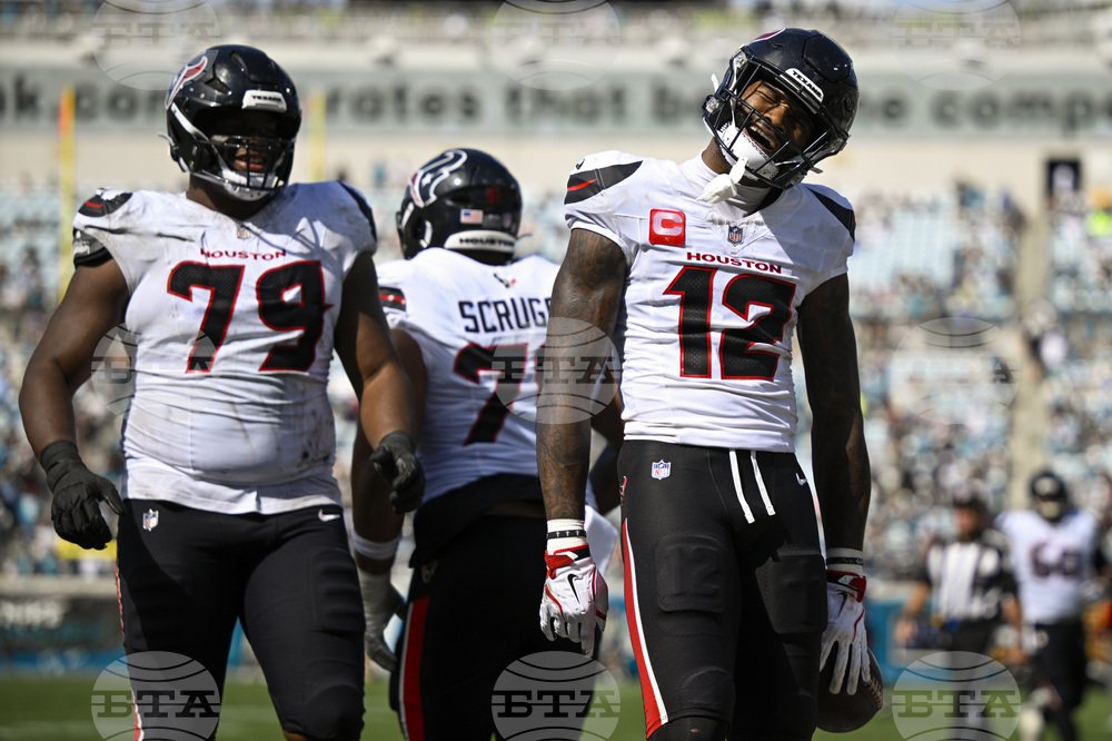 Houston Texans wide receiver Nico Collins (12) celebrates a touchdown against the Jacksonville Jaguars during the second half of an NFL football game Sunday, Sept. 21, 2025, in Jacksonville, Fla. (AP Photo/Phelan M. Ebenhack)