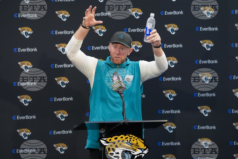 Jacksonville Jaguars head coach Liam Coen talks to reporters following an NFL football game against the Houston Texans Sunday, Sept. 21, 2025, in Jacksonville, Fla. (AP Photo/John Raoux)