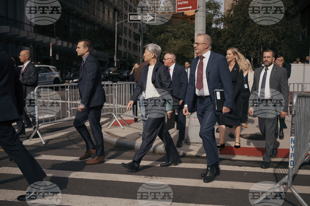 Australian Prime Minister Anthony Albanese, center right, and Minister for Foreign Affairs of the Commonwealth of Australia Penny Wong, center left, walk towards the United Nations headquarters during the 80th session of the United Nations General Assembly in New York, Sunday, Sept. 21, 2025. (AP Photo/Andres Kudacki)
