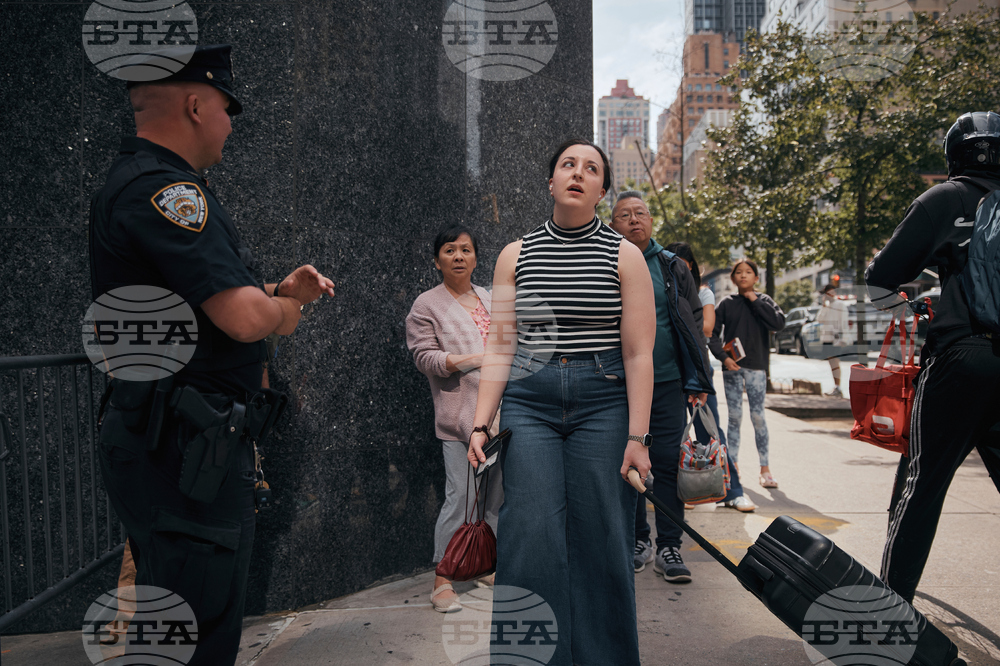 A police officer, center, stands guard as a woman walks towards the United Nations headquarters during the 80th session of the United Nations General Assembly in New York, Sunday, Sept. 21, 2025. (AP Photo/Andres Kudacki)