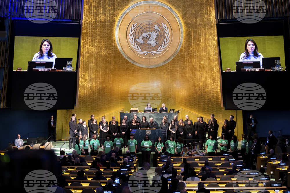 Annalena Baerbock, president of the 80th session of the United Nations General Assembly (UNGA), and Antonio Guterres, the UN Secretary General, exit the stage after commencing High-Level Week of the 80th session of the UNGA at United Nations headquarters, Monday, Sept. 22, 2025. (AP Photo/Angelina Katsanis)