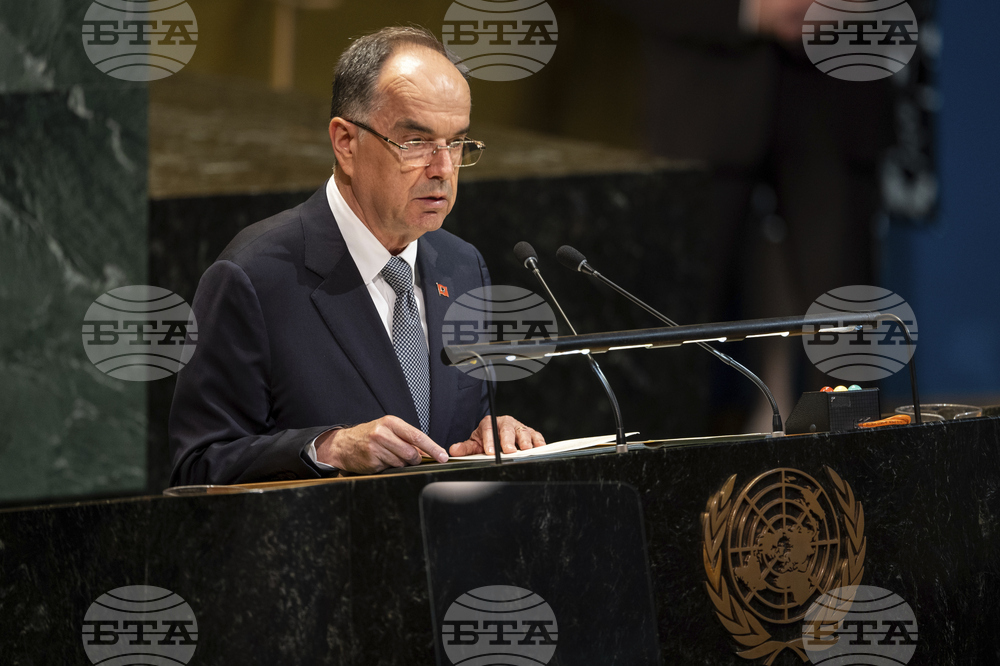 Bajram Begaj, President of Albania, addresses the 80th session of the UN General Assembly at the High-level meeting convened on the thirtieth anniversary of the Fourth World Conference on Women at the United Nations headquarters, Monday, Sept. 22, 2025. (AP Photo/Angelina Katsanis)