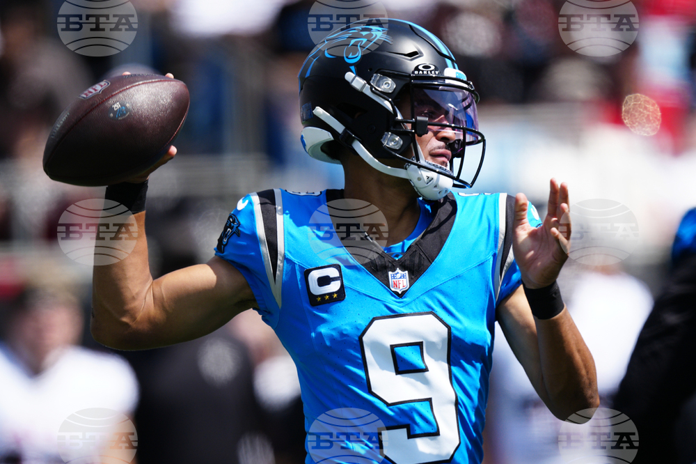 Carolina Panthers quarterback Bryce Young passes against the Atlanta Falcons during the first half of an NFL football game, Sunday, Sept. 21, 2025, in Charlotte, N.C. (AP Photo/Jacob Kupferman)