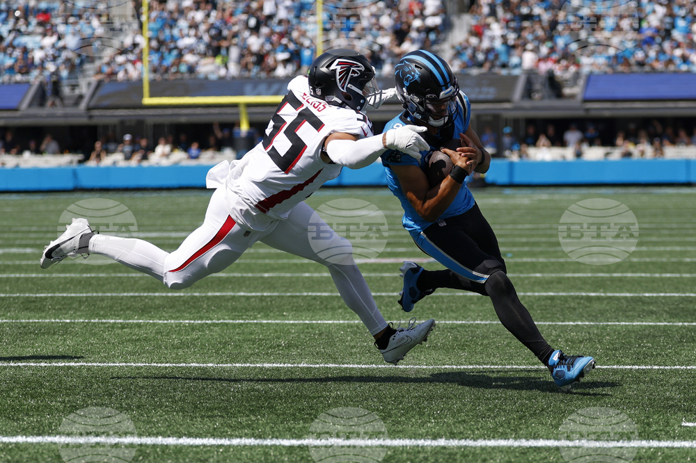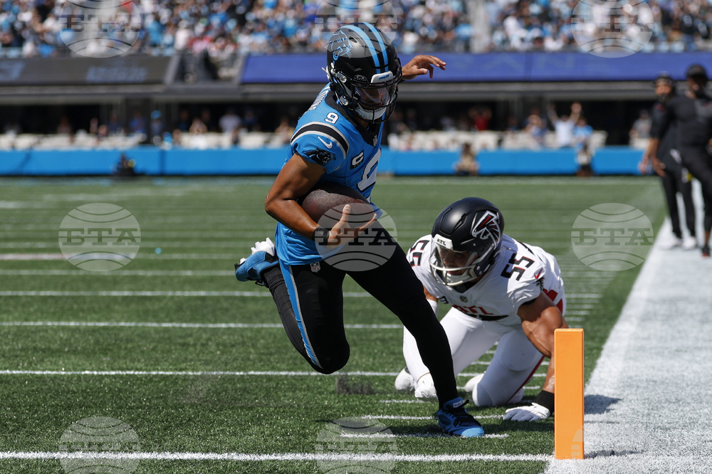 Carolina Panthers quarterback Bryce Young scores past Atlanta Falcons linebacker Kaden Elliss during the first half of an NFL football game, Sunday, Sept. 21, 2025, in Charlotte, N.C. (AP Photo/Rusty Jones)