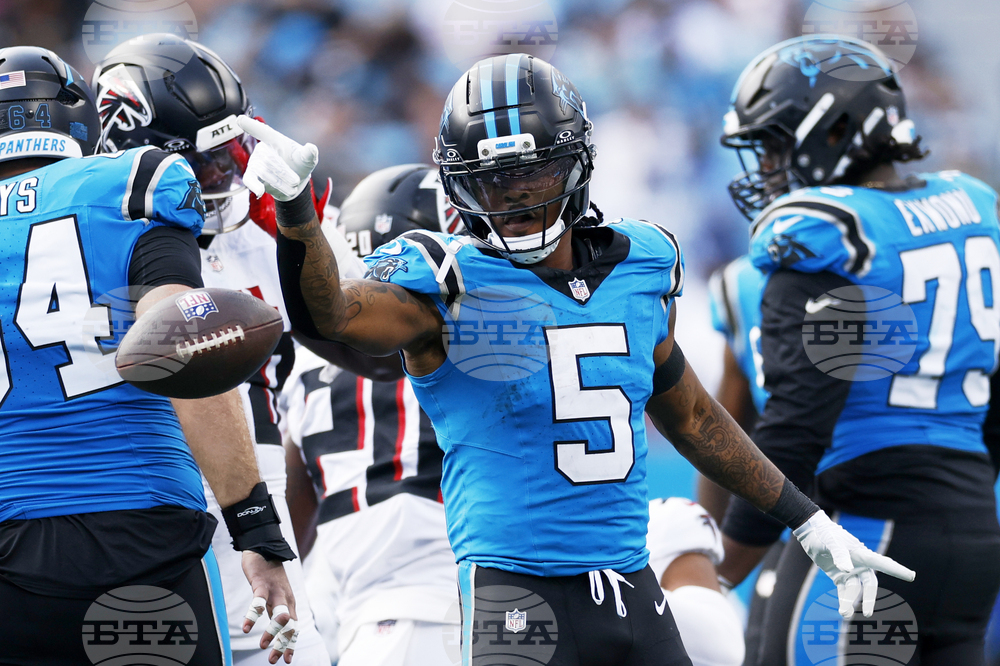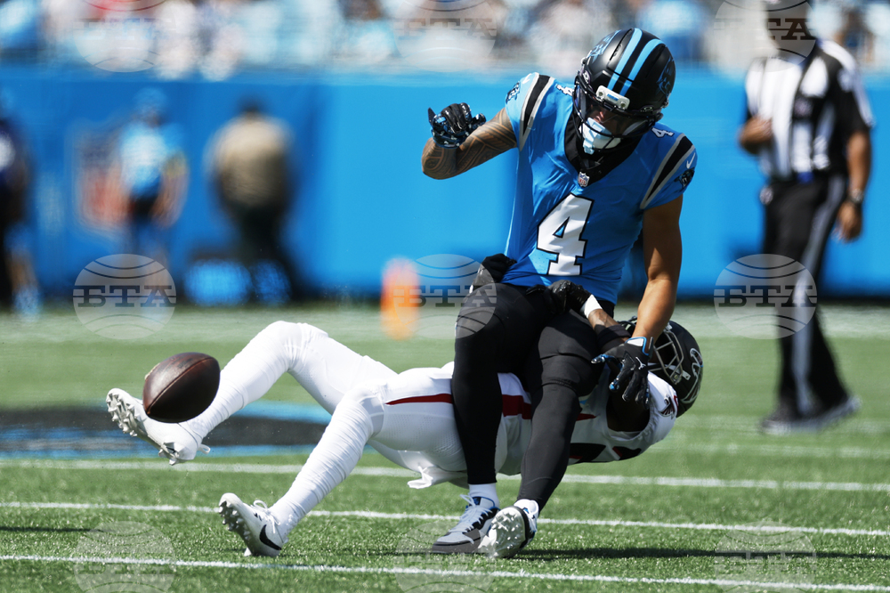 Carolina Panthers cornerback Jaycee Horn breaks up a pass intended for Atlanta Falcons wide receiver Darnell Mooney tpxduring the first half of an NFL football game, Sunday, Sept. 21, 2025, in Charlotte, N.C. (AP Photo/Rusty Jones)