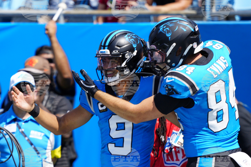 Carolina Panthers quarterback Bryce Young celebrates after scoring with tight end Mitchell Evans against the Atlanta Falcons during the first half of an NFL football game, Sunday, Sept. 21, 2025, in Charlotte, N.C. (AP Photo/Jacob Kupferman)