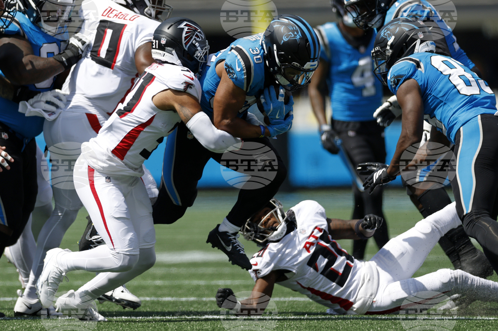 Carolina Panthers running back Chuba Hubbard is tackled by Atlanta Falcons safety Xavier Watts during the first half of an NFL football game, Sunday, Sept. 21, 2025, in Charlotte, N.C. (AP Photo/Rusty Jones)