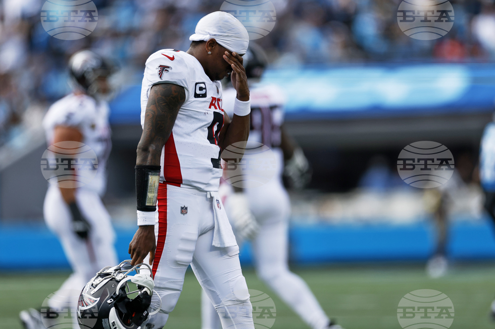 Atlanta Falcons quarterback Michael Penix Jr. walks to the sideline during the second half of an NFL football game against the Carolina Panthers, Sunday, Sept. 21, 2025, in Charlotte, N.C. (AP Photo/Rusty Jones)