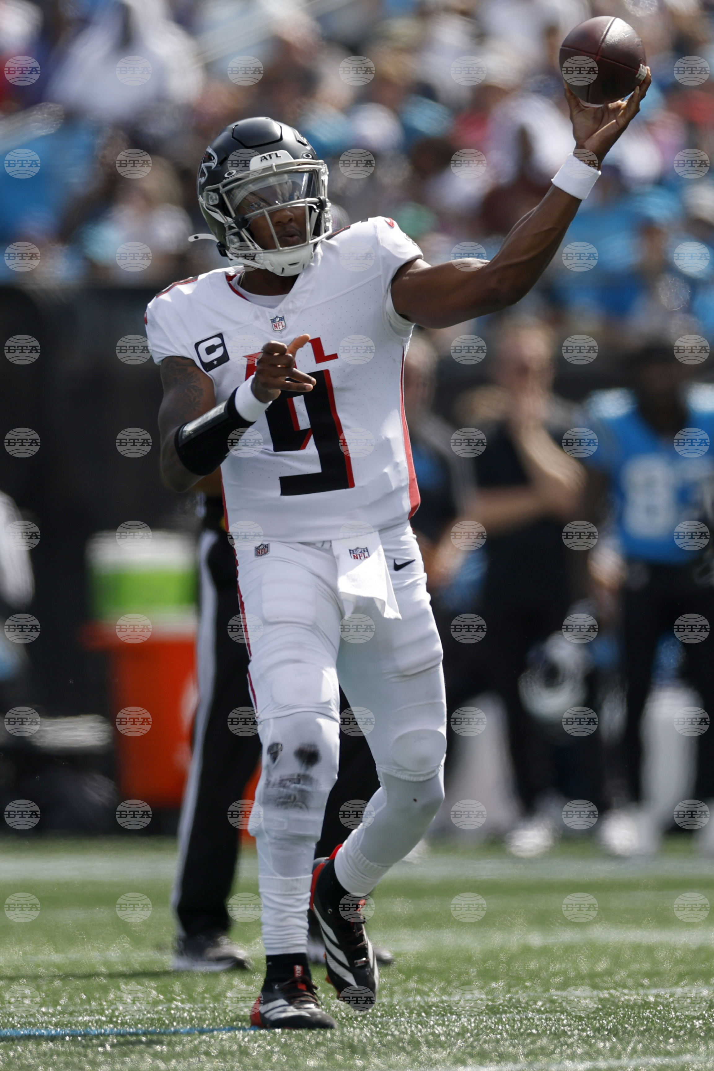 Atlanta Falcons quarterback Michael Penix Jr. passes against the Carolina Panthers during the second half of an NFL football game, Sunday, Sept. 21, 2025, in Charlotte, N.C. (AP Photo/Rusty Jones)
