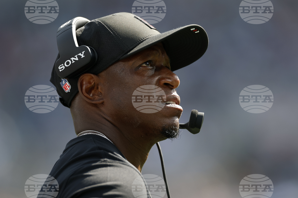 Atlanta Falcons head coach Raheem Morris watches during the second half of an NFL football game against the Carolina Panthers, Sunday, Sept. 21, 2025, in Charlotte, N.C. (AP Photo/Rusty Jones)