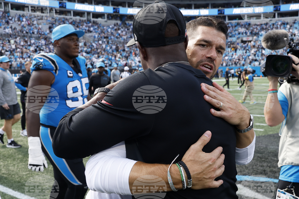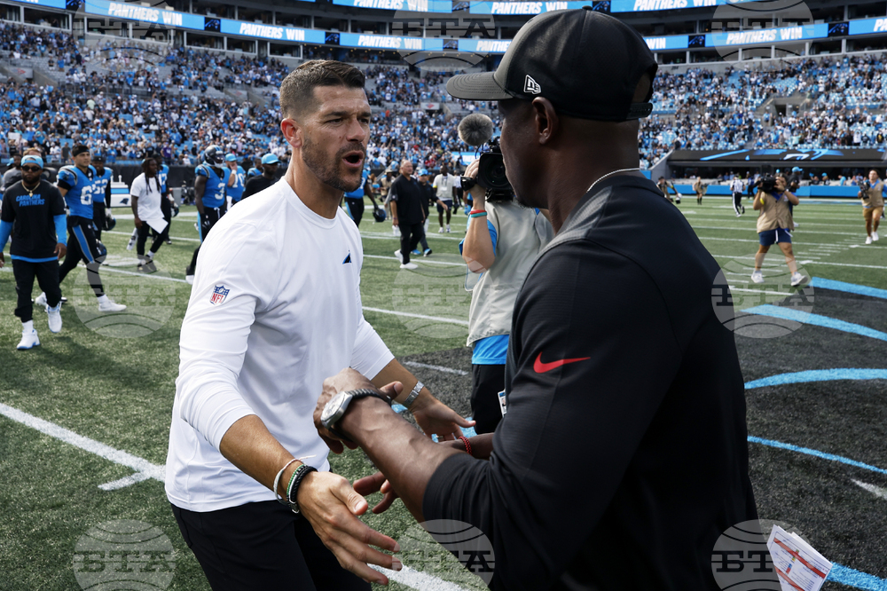 Carolina Panthers head coach David Canales greets Atlanta Falcons head coach Raheem Morris after their win in an NFL football game, Sunday, Sept. 21, 2025, in Charlotte, N.C. (AP Photo/Rusty Jones)