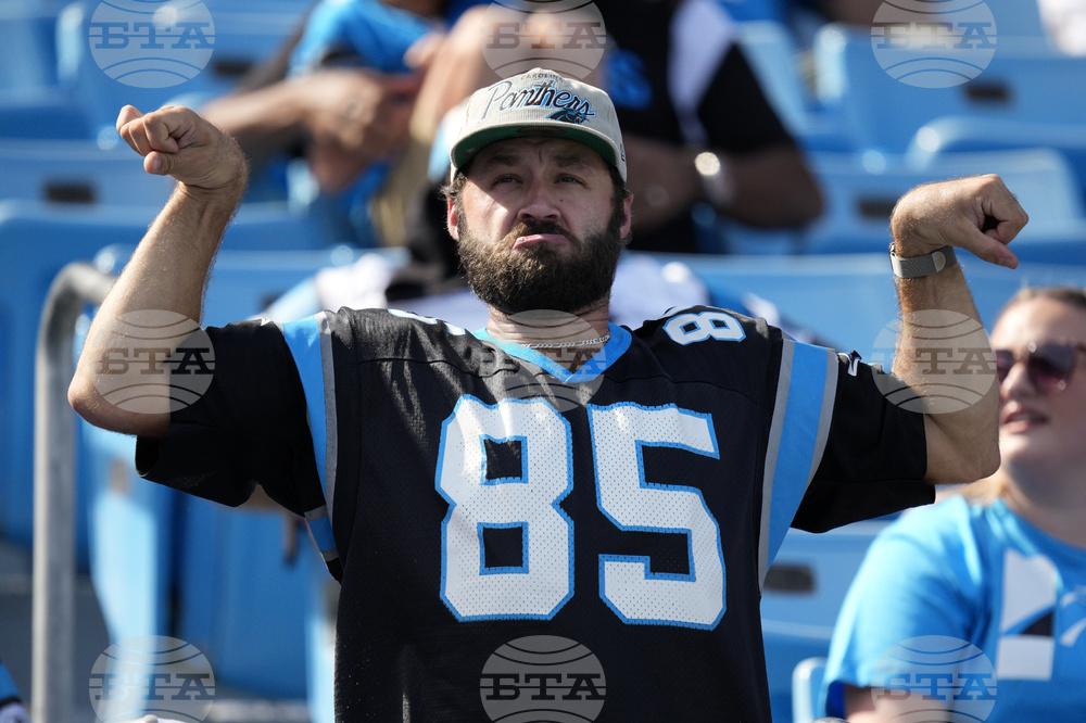Carolina Panthers fans react during the first half of an NFL football game against the Atlanta Falcons, Sunday, Sept. 21, 2025, in Charlotte, N.C. (AP Photo/Jacob Kupferman)