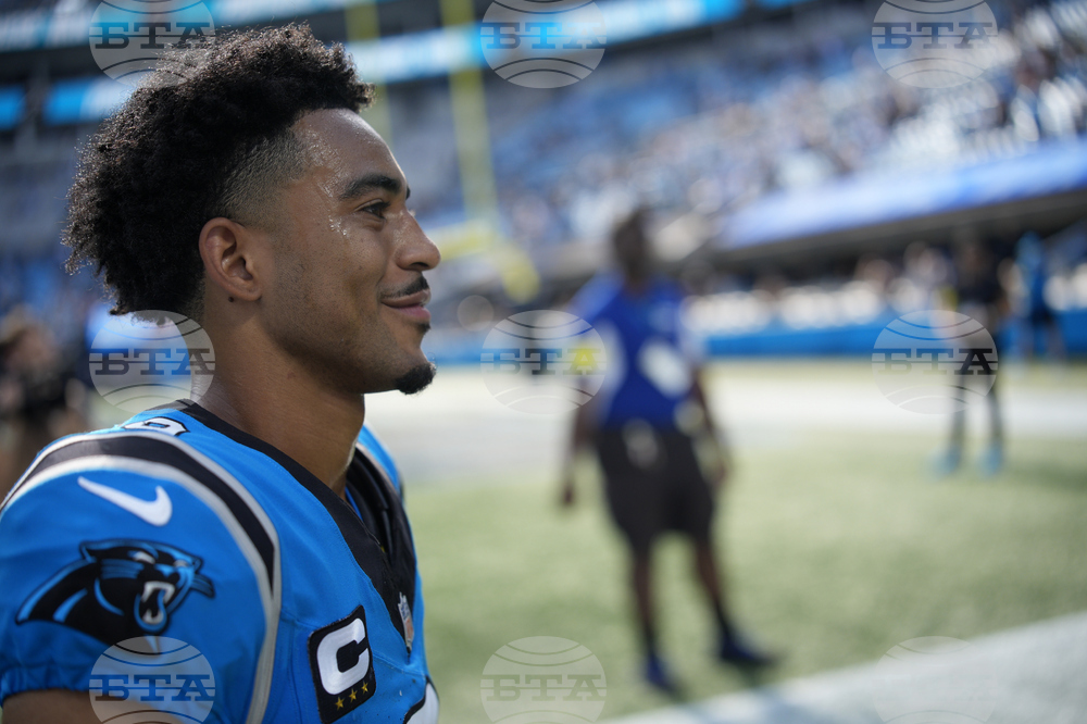 Carolina Panthers quarterback Bryce Young smiles after an NFL football game against the Atlanta Falcons, Sunday, Sept. 21, 2025, in Charlotte, N.C. (AP Photo/Jacob Kupferman)